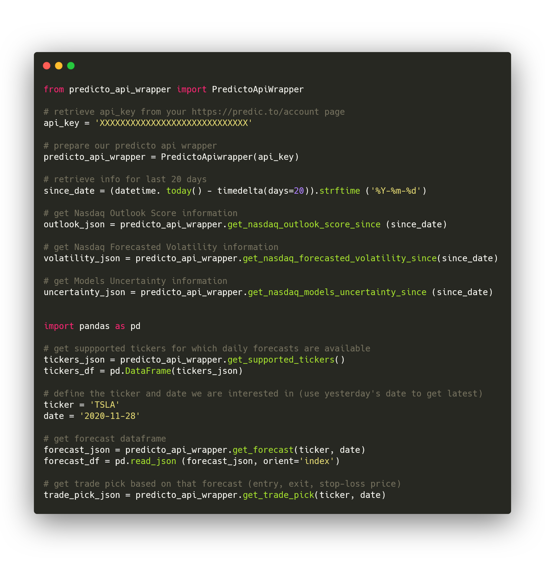 Latest Forecasts and Trade Picks are available daily for programmatic access using Python. Easy integration with Alpaca. Code and Jupyter Notebooks available in our GitHub repo