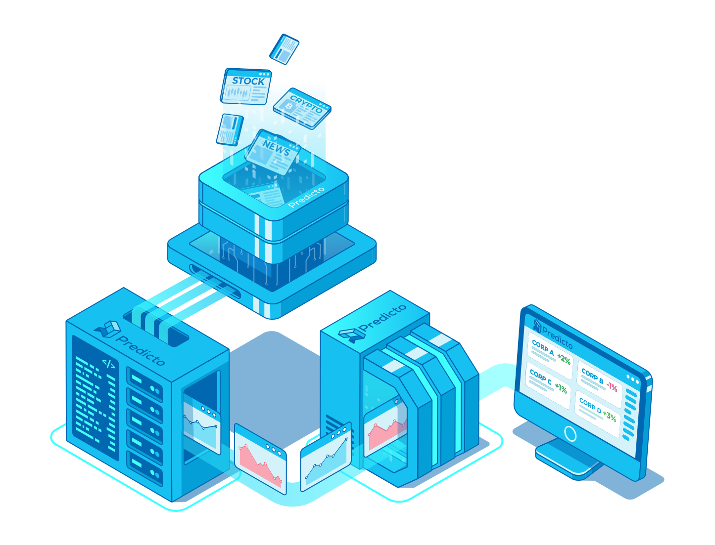 Predicto consumes raw data from a diverse list of data sources. Our models generate short-term forecasts and trades. By monitoring our models' recent performance, we filter those trades daily. Our AI market insights are delivered to your inbox daily or on your request. Everything automated.